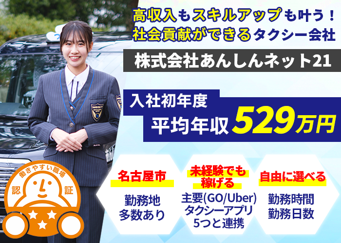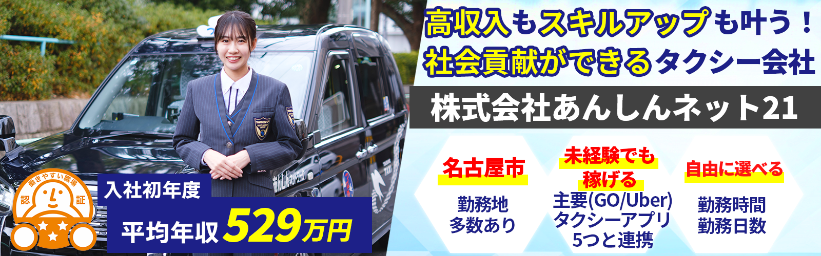 \東海圏最大手のつばめタクシーグループ/ 名古屋市内でタクシードライバーのお仕事をお任せします。 介護送迎や警備兼任ドライバ―など、幅広いタクシー業務があるため、とてもやりがいを感じやすいです。 「社会貢献をしたい」「人の役に立ちたい」 そんな方にピッタリです! <おすすめポイント> ■入社初年度の平均年収は529万円 タクシードライバーの平均年収が375万円(全国区)に対しあんしんネットではなんと529万円! 「どうしてそんなに稼げるの…?」↓ ・売上シェア&配車数No.1!名古屋市内で圧倒的な知名度 ・最新AIシステムを活用!人が集まっている場所がナビで一目でわかる! ■業界日本一!バツグンの教育制度 入社から1年間手厚いサポートがあるので未経験者も安心! 基本的なマナー研修・運転研修はもちろん、稼ぎ方の勉強会も随時開催☆ 二種免許だけでなく警備や介護の資格も取得できるため、スキルも収入も手に入れられます! ■主要タクシーアプリ5つと連携!自動的に売上アップ♪ 通常、配車アプリは所定の研修などが完了してからでないと利用できません。当社は主要5大アプリ(例:GO、Uber など)に即対応。 入社後すぐにアプリ経由の配車を受けられるため、早い段階から売上を作りやすい環境が整っています。 ■職場認証三つ星取得 国土交通省が定める「働きやすい職場認証制度」において三つ星を取得! 愛知県ではあんしんネットのみが取得しており、業界トップクラスの働きやすさが認められています。 女性専用ロッカールームの整備や休日選択制度など、法令遵守にとどまらない充実した職場環境です。 ■社員を第一に考える会社 「タクシーの仕事は激務で大変そう…」そんなイメージを覆します! 独自のお客様リストを活用し、トラブルを未然に防止!安心して働ける環境♪ 年間休日216日・日勤のみ・時短勤務など働き方が選べる◎ ご自身のプライベートや稼ぎたい金額に合わせてシフトを組むことが可能です! 【勤務地は相談可能】 名古屋市内を中心に、幅広いエリアで募集中! ご自宅から通いやすい場所で勤務していただけます。 ☆名古屋市がオススメな理由 中部地方(東海エリア)で一番「稼ぎやすい街」、それが名古屋。 人口、観光地、大手企業の本社・支社などが多く、未経験でも高収入を目指せます。 東京・大阪に比べ生活コストがかかりづらいため、手元に残る収入が多いのも魅力です◎ 【募集雇用形態】 正社員 試用期間最大6ヶ月 【入社支援金】 最大20万円支給(規定あり) |